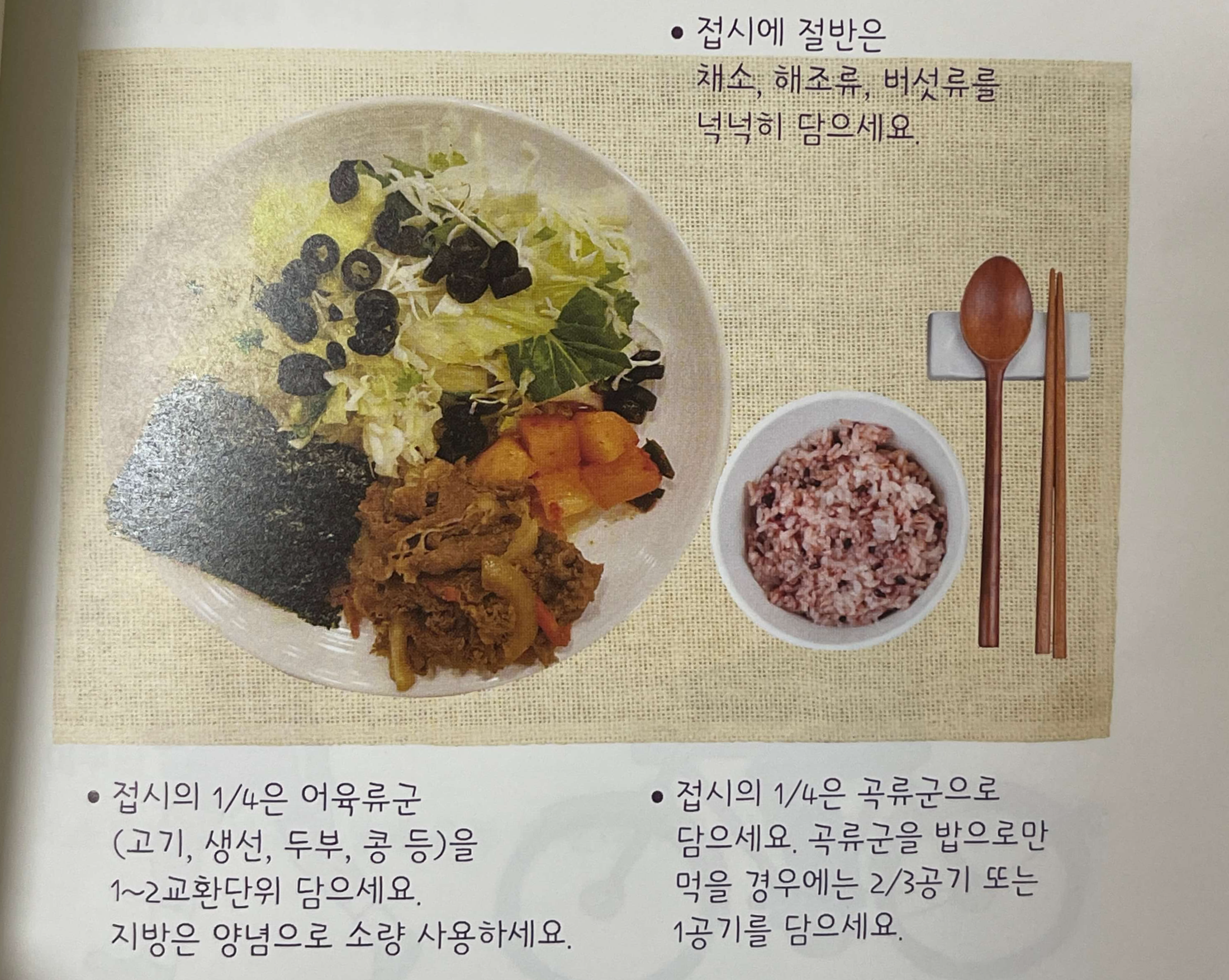 | 1. 접시의 절반은 채소, 해조류, 버섯류를 넉넉히 담습니다. ( 열량 낮은 식품군으로 추가로 넉넉하게 먹어도 됩니다) |