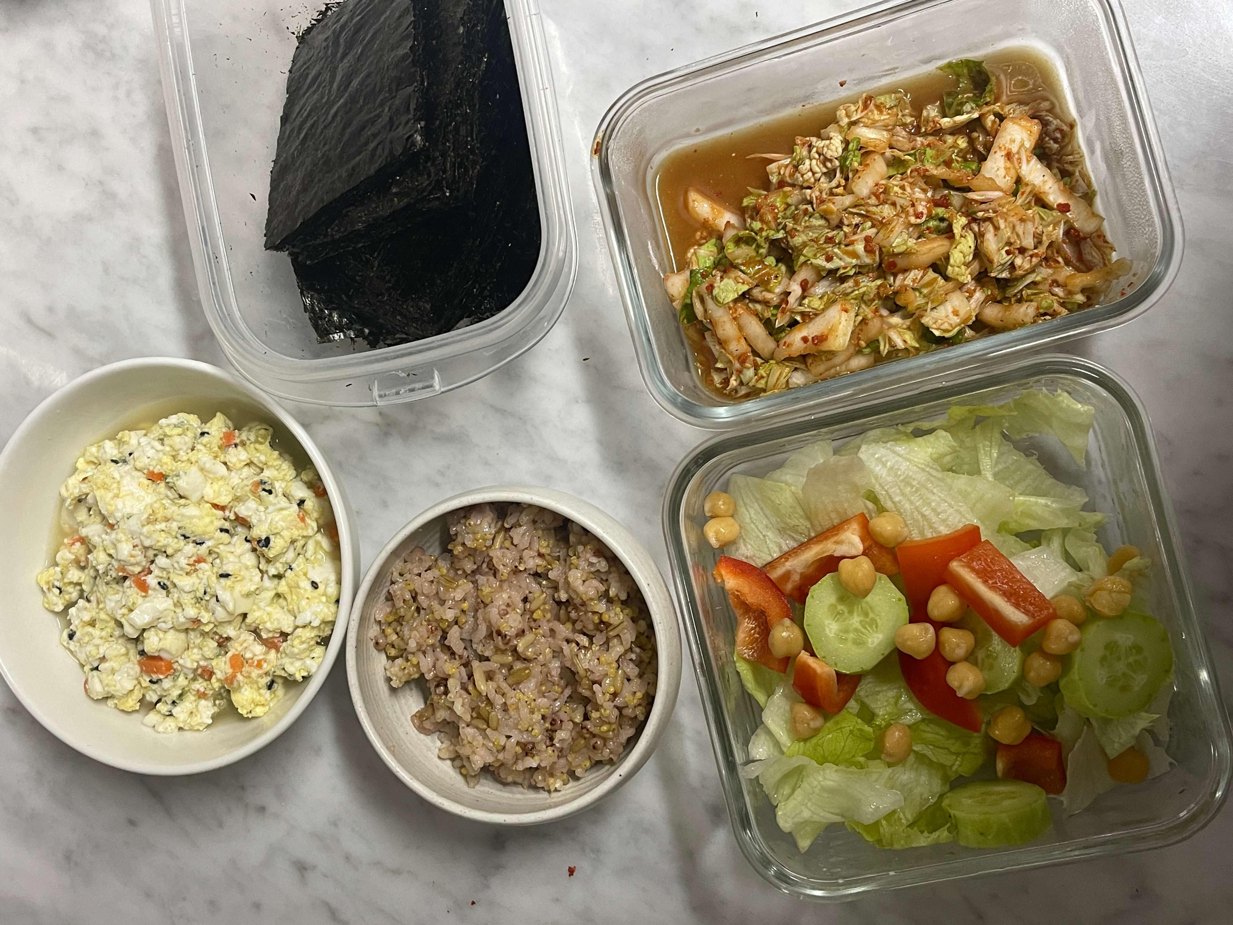 | 단백질: 계란 1개, 순두부 1개, 병아리콩 |