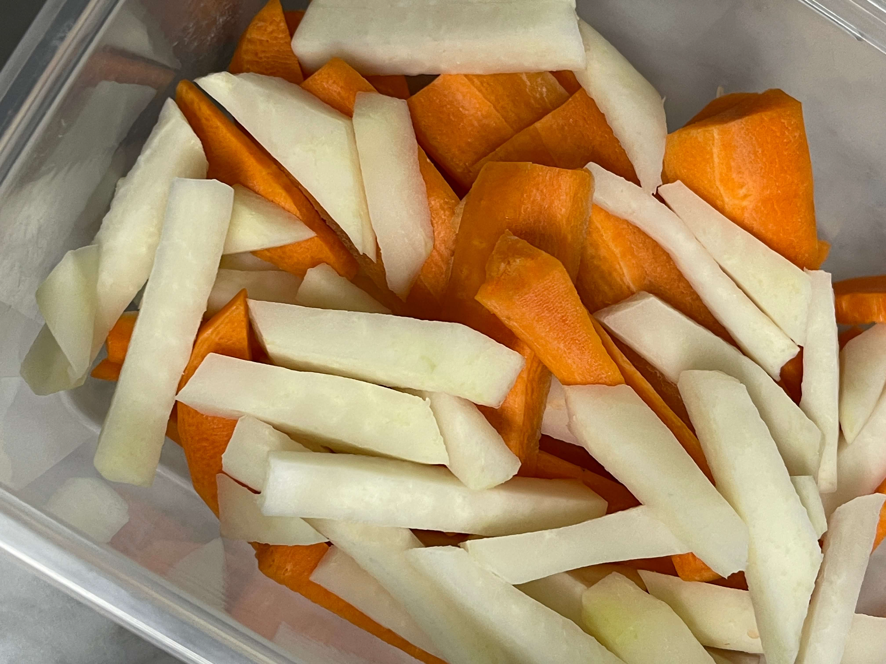 당근과 콜라비를 길게 잘라서 스틱으로 소량 먹고 있습니다.