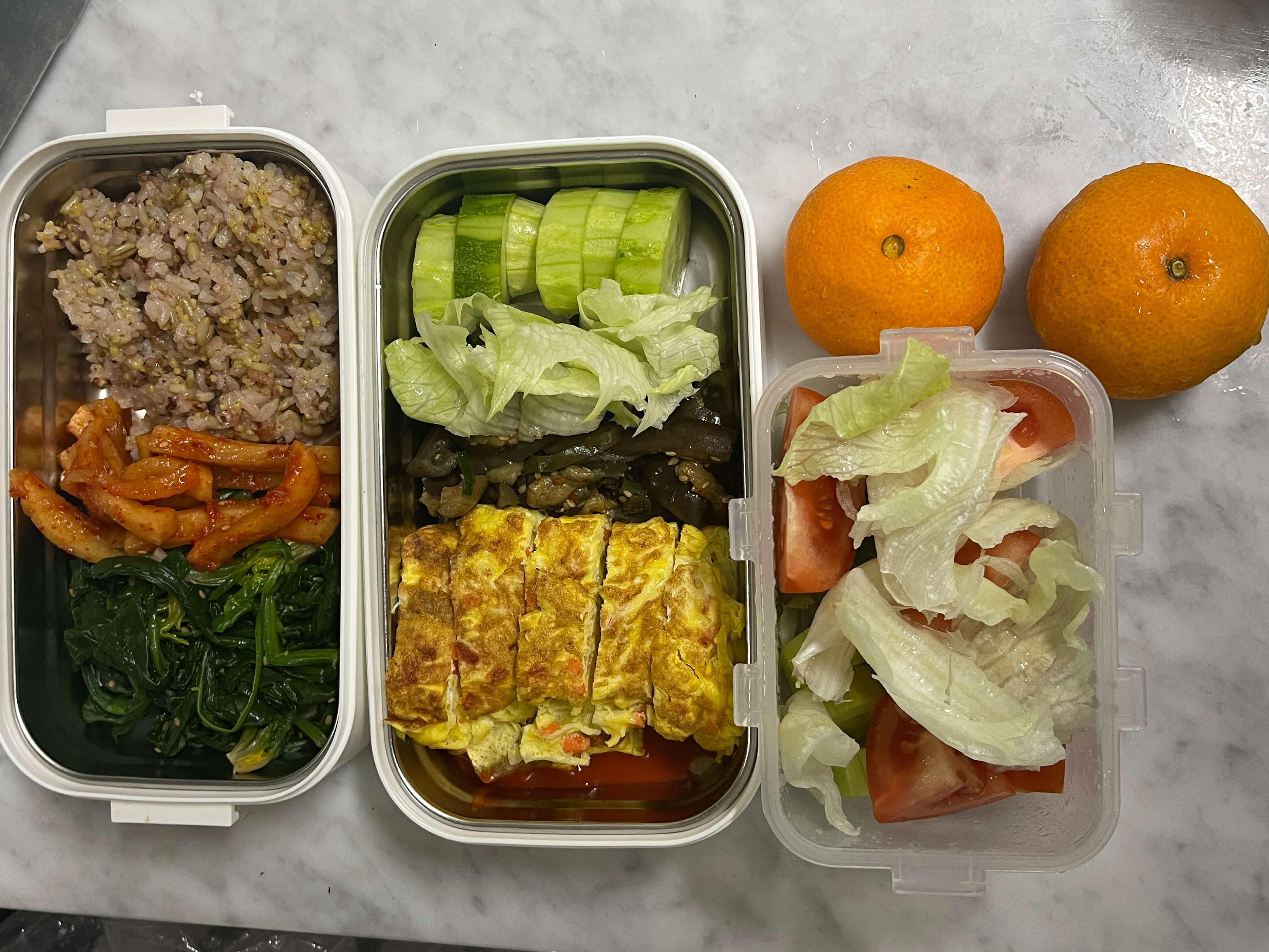 오늘 점심 도시락은 양배추와 당근을 넣은 계란말이와 시금치, 가지, 무김치입니다.